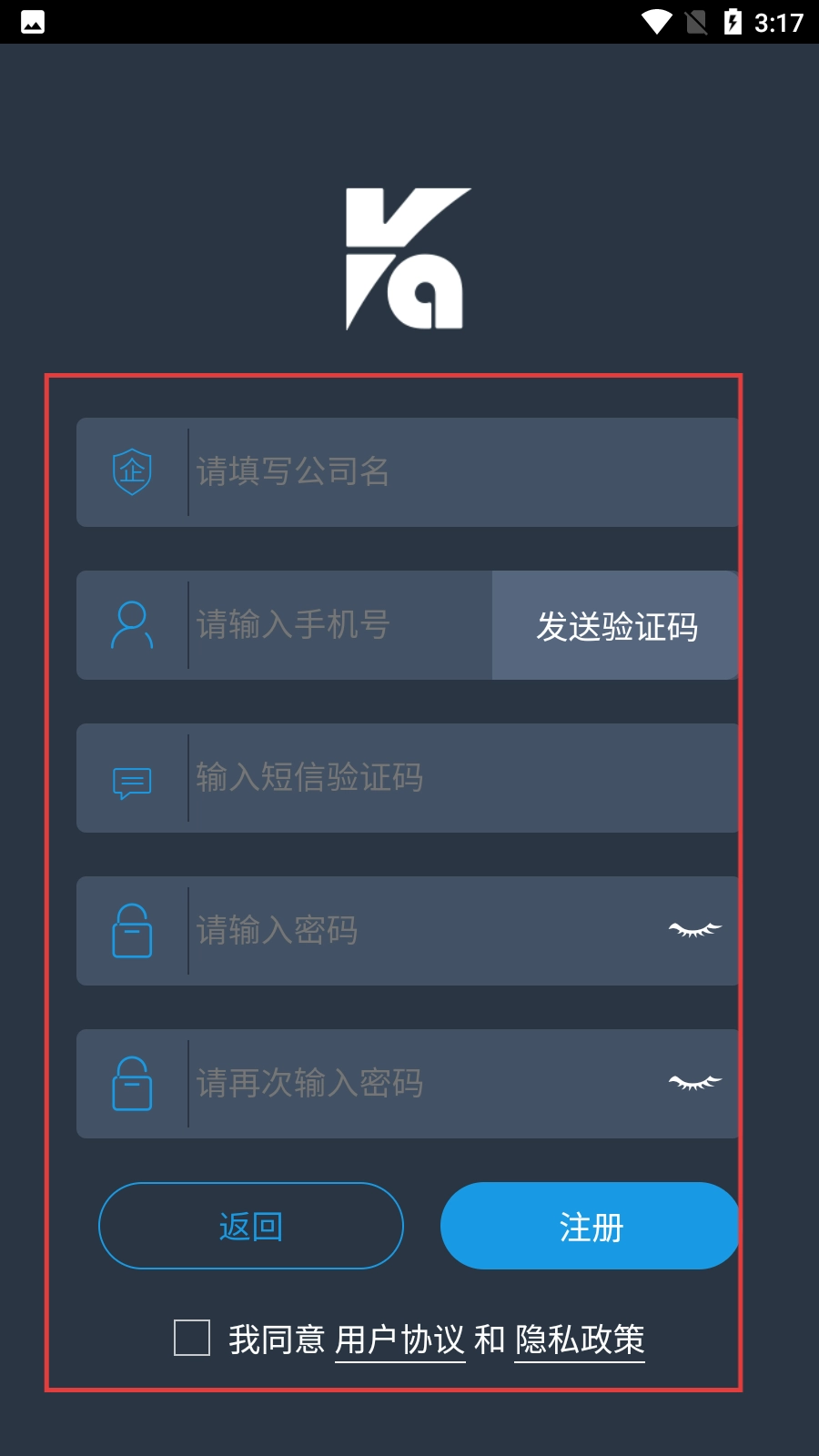 4、进入注册页面后,依次填写【公司名】、号,获取并输入验证码,设置好密码后点击【注册】按钮,即可完成账号注册流程。