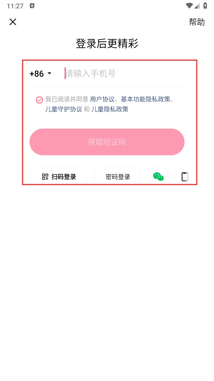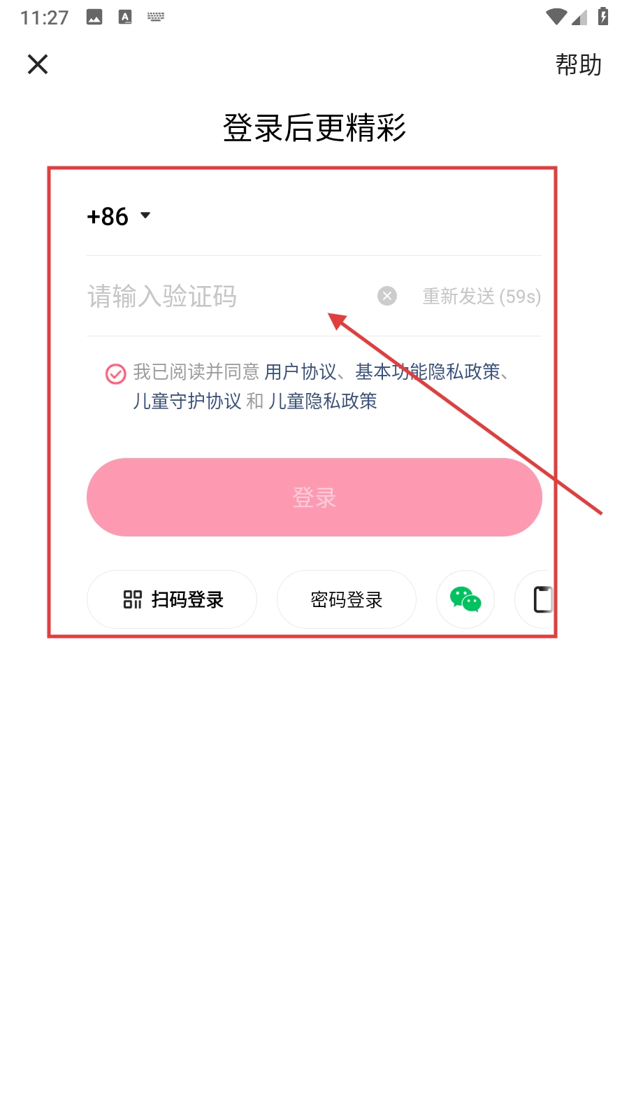 3、进入登录界面后,输入账号,勾选同意相关协议,再点击【获取验证码】,即可启动验证码登录流程。