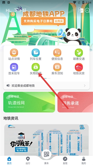 1、打开成都地铁首页后,点击【失物招领】的功能入口,就能进入失物招领页面,开启查找遗失物品的流程。