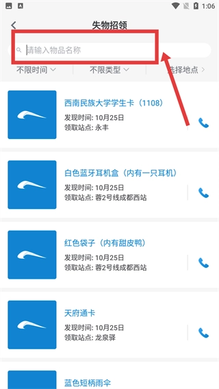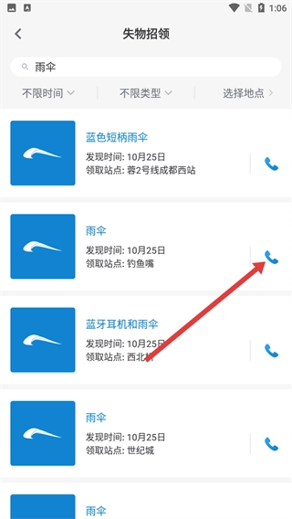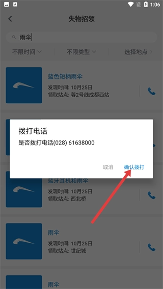 3、在失物搜索结果里,找到对应物品旁边的电话图标并点击,就能弹出拨打电话的窗口。