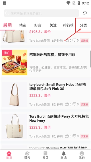 6、点击首页顶部导航栏的【分类】按钮,即可进入商品分类页面,以便快速筛选各类商品。