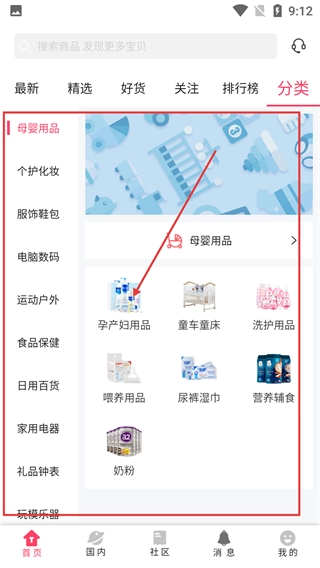 7、进入分类页面后,选择【母婴用品】分类,就能看到孕产用品、车床童床等细分品类的商品列表。