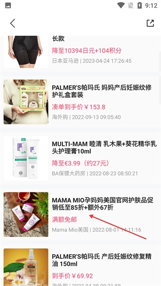 8、在母婴用品分类中找到目标商品(例如【MAMA-MIO孕妈妈美国护肤品】)并点击,进入商品列表页面即可查看具体的折扣详情。