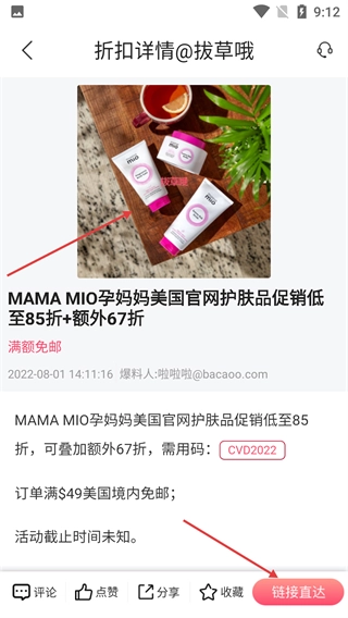 9、进入商品折扣详情页,能查看优惠力度(例如低至85折再叠加额外67折)、优惠码以及活动规则,点击【链接直达】即可跳转至购买页面。
