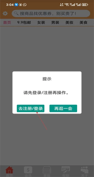 1、启动软件后,若出现提示需先登录注册的弹窗,点击“去注册登录”按钮,即可进入账号操作界面。