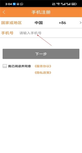 3、进入注册页面后,先输入号码,接着勾选服务协议与隐私政策,再点击下一步,即可完成整个注册流程。