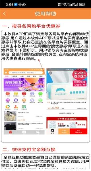 4、完成注册后进入使用帮助页面,查看关于搜寻各网购平台优惠券的说明内容,通过浏览这些信息来了解软件功能的具体使用方法。