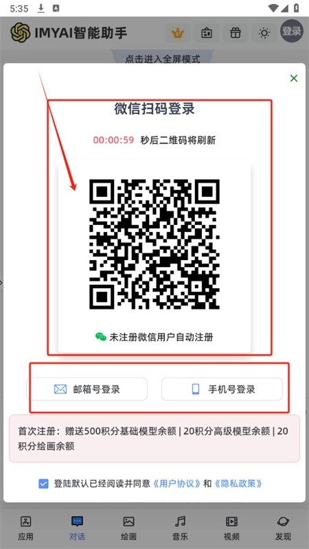 您可以通过微信扫码,或者使用邮箱、手机号来登录IMYAI智能助手App。
