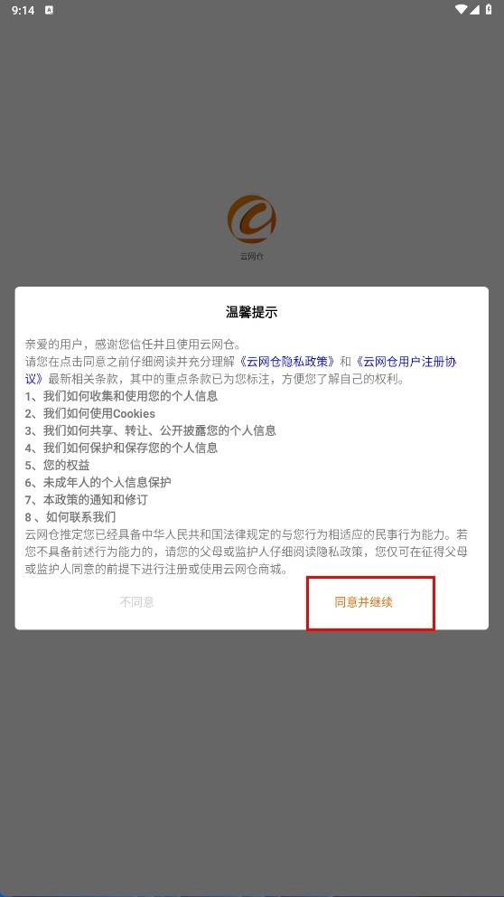 1. 首次打开时,点击【同意并继续】按钮,确认《云网仓隐私政策》和《用户注册协议》后,即可进入下一步操作。