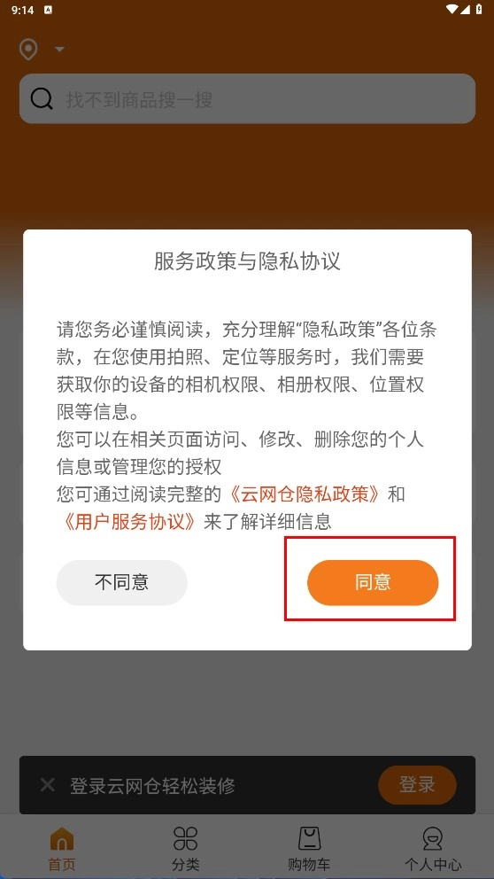 2. 在服务政策与隐私协议的弹窗中,点击【同意】按钮,授权应用获取相机、相册、位置等必要权限,以此完成权限确认步骤。