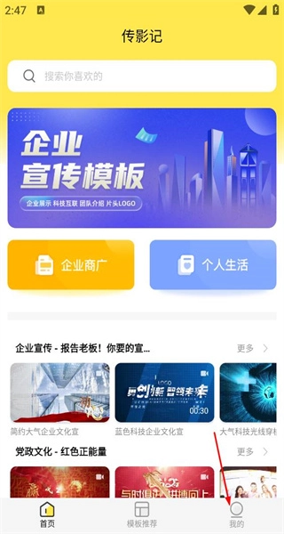 打开软件进入首页后,能看到企业宣传模板、企业商广和个人生活分类,点击底部的“我的”,即可进入个人中心页面。