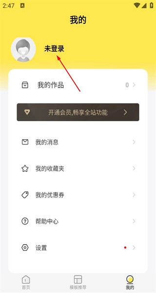 2、进入个人中心页面后,能看到处于未登录状态,同时还有我的作品、开通会员等功能选项,接下来打算进行登录相关的操作。