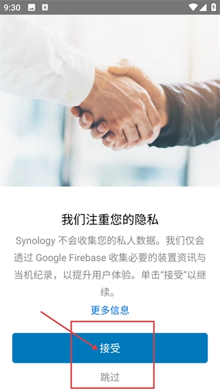 1、在隐私提示界面,了解【Synology】的隐私政策后,可选择【接受】或【跳过】按钮,以继续推进软件流程。