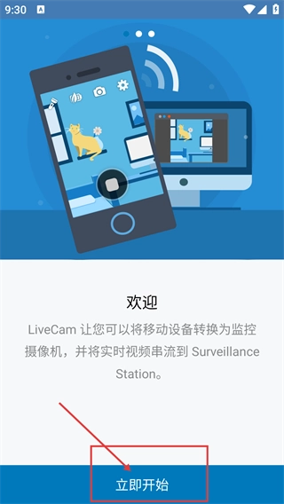 2、在【欢迎】界面,清晰说明【LiveCam】能够把移动设备转变为监控摄像机,点击【立即开始】进入功能配置流程。