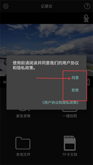 1、进入记录仪界面后,会弹出“使用前请阅读并同意我们的用户协议和隐私政策”的提示,必须选择【同意】才能继续使用相关功能。