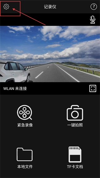 进入记录仪主界面后,能看到【紧急录像】【一键拍照】等功能按钮,点击左上角的【设置】图标即可进入设置页面。