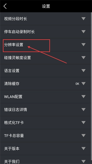 3、在【设置】页面里,有【视频分段时长】等多个选项,点击【分辨率设置】就能展开相应的参数选择列表,从而进行画质调整。