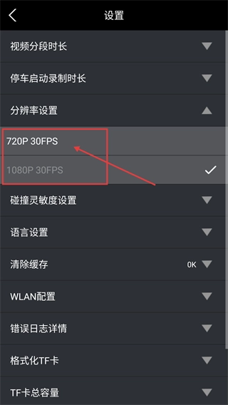 4、点击【分辨率设置】后,会弹出【720P-30FPS】【1080P-30FPS】等选项,您可以根据自身需求选择相应的分辨率。