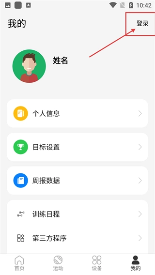 3、在【我的】页面,点击右上角的【登录】按钮,能进入账号登录界面,登录后可以同步运动数据、管理个人信息。