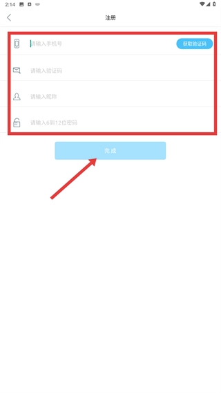 4、在注册页面,按顺序填写账号、验证码等信息后,点击【完成】按钮即可完成注册。