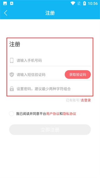 3、登录页面提供账号密码登录和快捷登录两种方式,若您还没有账号,点击【去注册】按钮即可跳转到注册界面,完成账号的创建。