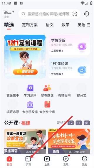 1、进入课程首页后,点击底部的【学习】按钮,即可进入整合了【题库】【学习资料】等功能的学习页面,在这里可以根据需求选择对应学科的资源。