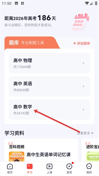 2、在【学习】页面的【题库】板块里,找到并点击【高中数学】选项,进入该学科的题库内容页面,查看题目数量等相关信息。