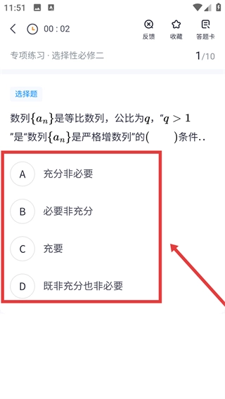 4、在专项练习界面完成这道等比数列题的作答后,可知其答案为【D-既非充分也非必要】。原因在于,由q>1无法推出数列严格递增,而数列严格递增也并不一定需要q>1这一条件。