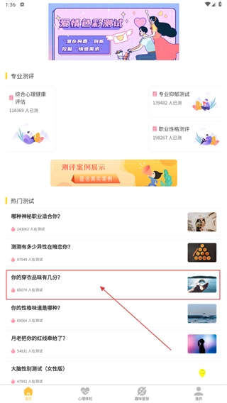 1、在首页的热门测试区域,点击“你的穿衣品味有几分?”这一选项,即可进入该测试的对应页面。