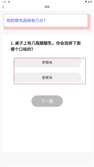 2、进入测试环节后,请根据题目要求选择对应的选项(例如“草莓味”“香蕉味”这类选项),完成所有题目的选择操作。