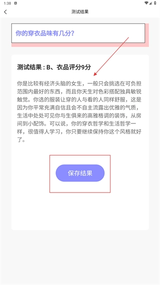 4、所有题目完成后,页面会呈现测试结果,点击“保存结果”按钮就能留存本次测试的结论。