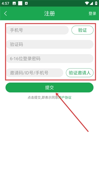 4、在注册页面,依次填写【号】【验证码】【6-16位登录密码】等信息后,点击【提交】按钮完成注册。