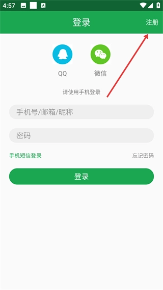 3、在登录界面,点击右上角的【注册】选项,进入账号注册页面后,可选择短信等注册方式。