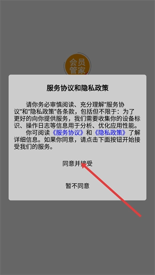 1、当【服务协议和隐私政策】弹窗出现时,请仔细阅读【服务协议】与【隐私政策】的条款内容,随后点击【同意并接受】按钮,即可进入下一步操作界面。