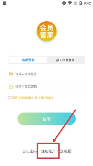 在【商家登录】页面,可选择【商家登录】或【员工账号登录】两种方式,点击页面下方的【注册账户】选项即可进入注册界面。