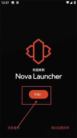 1、启动【Nova Launcher】后进入启动界面,点击【开始!】即可进入设置向导,在此可选择【还原备份】来恢复之前的配置,也能选择【跳过设置向导】直接使用基础功能。
