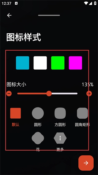 2、在【图标样式】设置页面中,你可以挑选图标颜色、调节图标大小(当前为135%),也能够切换图标形状,操作完成后点击箭头即可进入下一步。