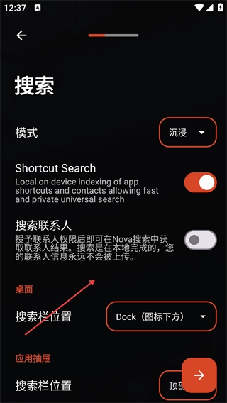 3、进入【搜索】设置页面后,你可以选择不同的搜索模式,开启本地快捷搜索功能,也能对桌面或应用抽屉的搜索栏位置进行设置,并且可以根据自身需求来配置隐私相关选项和显示选项。