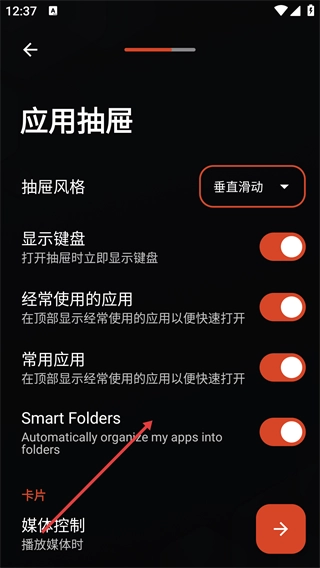 4、在【应用抽屉】设置页面,用户可以选择抽屉的展示风格(例如垂直滑动样式),开启显示键盘、常用应用置顶等功能选项,同时也能够启用智能文件夹自动整理应用的功能。