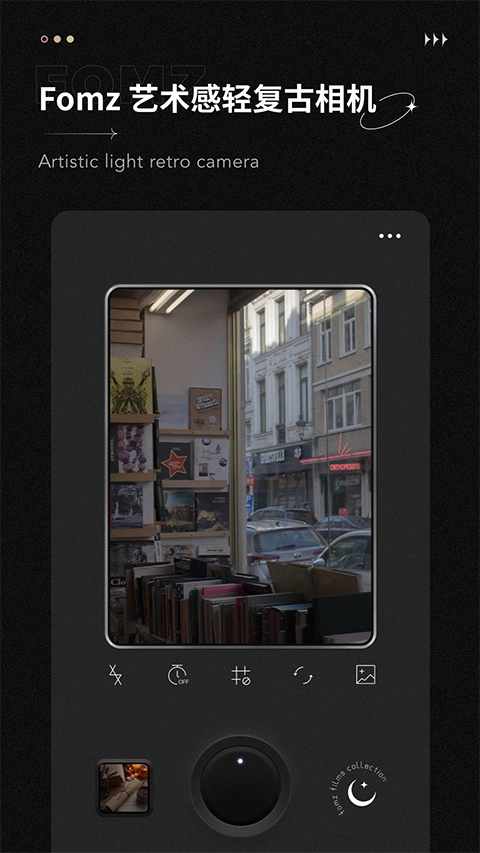 fomz软件是一款非常有艺术感的复古摄像软件,软件中多种拍摄方式并且还有多种滤镜可以使用,软件把众多的潮流元素和复古的拍摄方式结合在一起给用户不一样的使用体验,软件还可以模拟各种相机的种类并且拍摄出的照片都非常的复古并且还有经典的质感让用户爱不释手,软件会进行各种升级更新为用户带来更多的相机功能提升用户的使用体验。