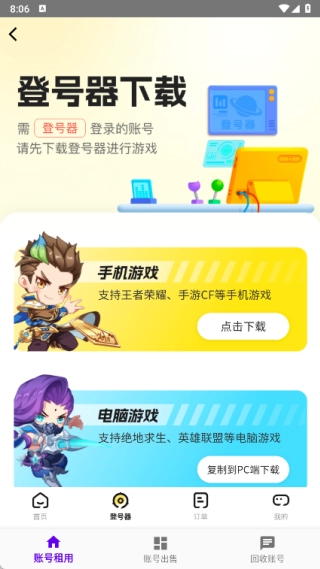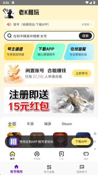 1、账号租用页面的首页设有号主通道、在线客服,还推出了闲置账号合租赚钱的活动;