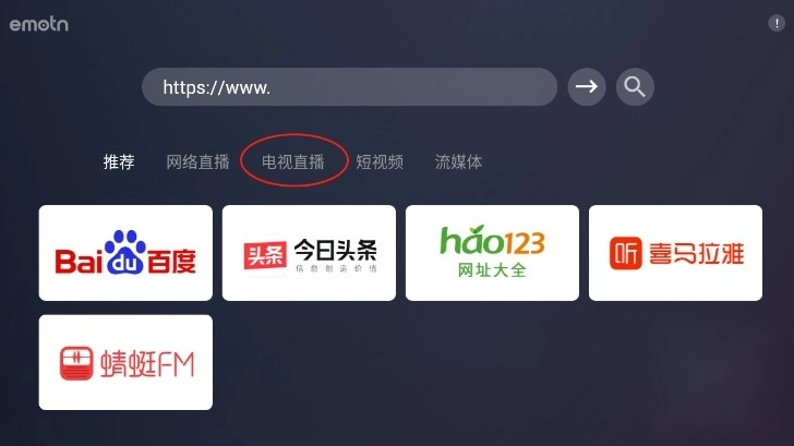 1、启动艾蒙顿浏览器应用,进入首页后点击“电视直播”选项。