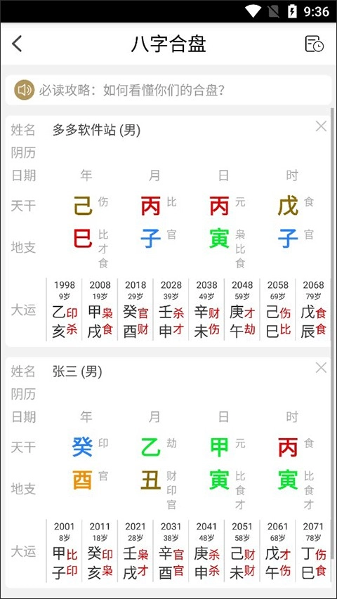 3、填写完成后,点击合盘按钮,就能获取详细的合盘结果。