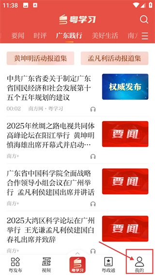 1. 打开粤学习APP后,进入包含要闻、时评等内容板块的首页,随后点击底部导航栏中的【我的】选项,即可进入个人中心页面。