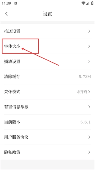 3. 进入设置页面(其中包含推送设置、播放设置等选项),找到并点击【字体大小】选项,即可进入字体调整页面。