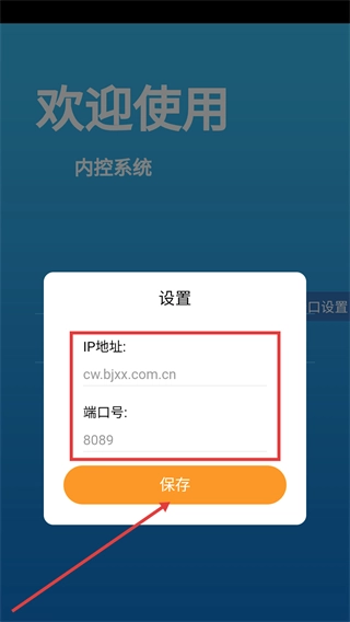 2、进入设置弹窗后,需确认或填写【IP地址(例如cw.bjxx.com.cn)】和【端口号(例如8089)】,以此完成系统连接参数的配置。