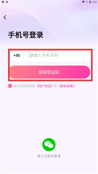 3、选择【账号登录】后,输入号码并点击【获取验证码】,填写验证码完成登录操作。
