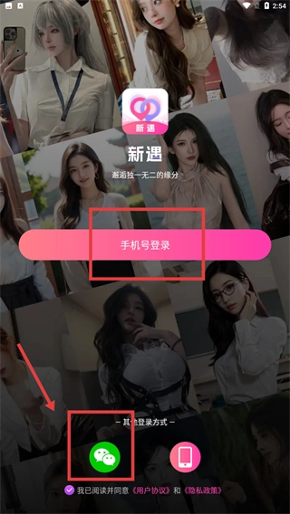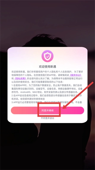 1、打开【新遇】应用,仔细阅读《服务协议》和《隐私政策》后,点击【同意并继续】按钮,即可进入登录选择界面。