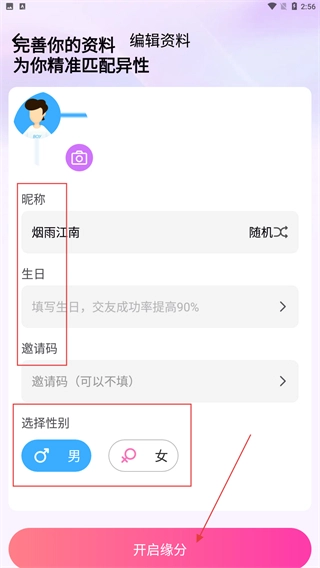 4、登录后进入资料完善页面,设置【昵称】和【生日】,选择【性别】,完成这些操作后点击【开启缘分】,即可进入应用的主功能界面。