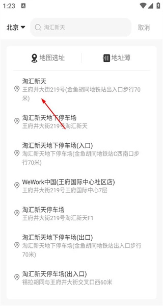 3、进入地址搜索页面后,浏览相关地址列表,找到并选择淘汇新天对应的地址,随后返回发货人信息页面。